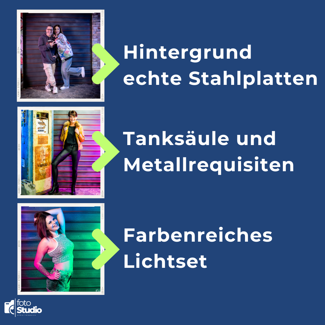 Ein urbanes Set, echte Stahlplatten, Vintage-Tankstelle und ein farbenreiches Lichtsetup – für Bilder, die garantiert auffallen.
